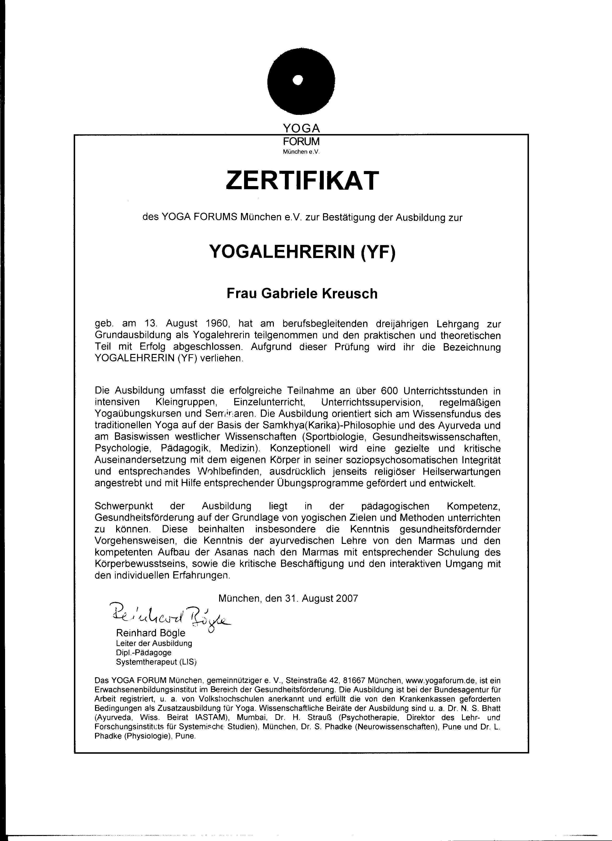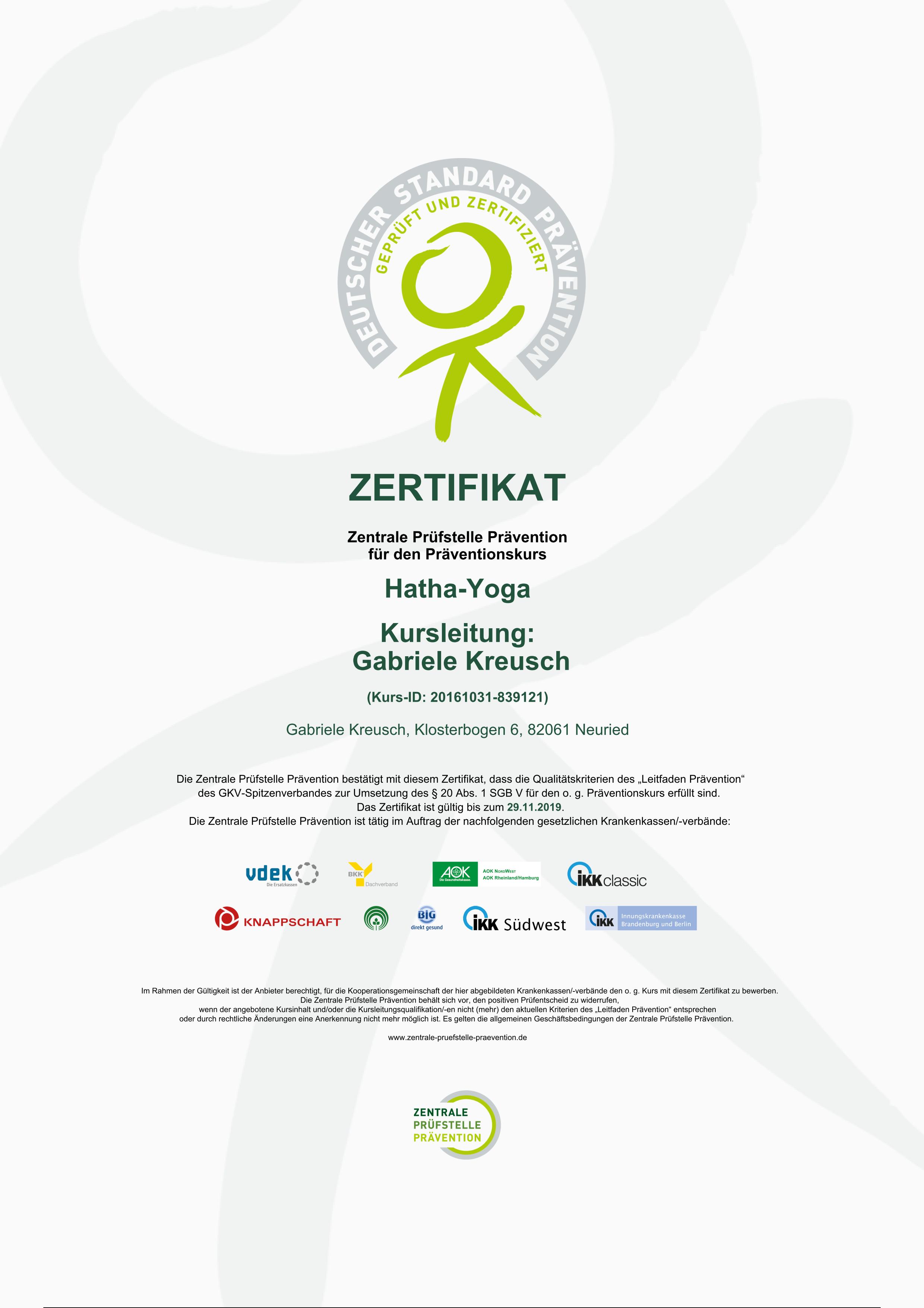 Zertifizierungen Meine Yoga-Kurse sind zertifiziert und werden von Krankenkassen bezuschusst. Zertifikat der Zentralen Prüfstelle für Prävention: Zertifikat als Yogalehrerin ausgestellt vom Yogaforum München: